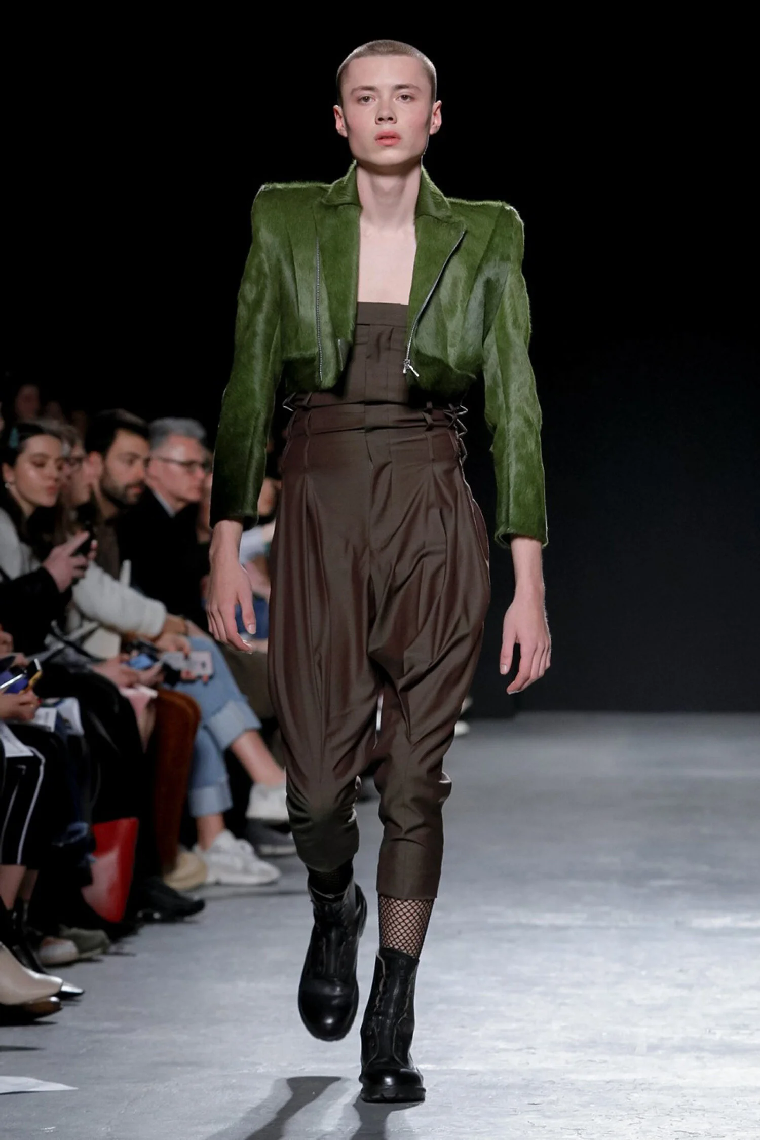 Cropped biker jacket in green cowhide with oversized shoulders pads.